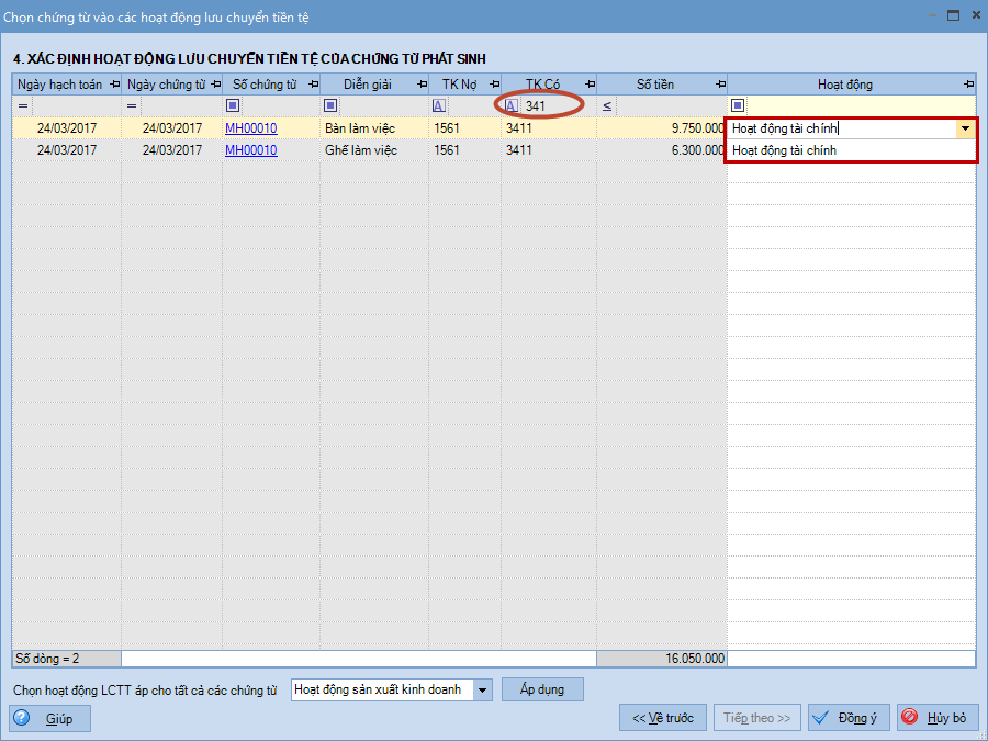 • Các chứng từ phát sinh liên quan đến TK Nợ hoặc Có 341, 311, 413, 421, 353, 356, đều được chọn vào Hoạt động tài chính.