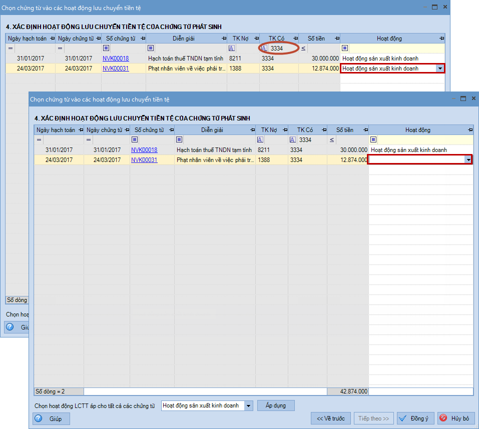 Ví dụ: Với các chứng từ có TK phát sinh đối ứng với TK 3334 (ngoài các TK TK 632, 635, 641, 642, 811 và các TK đã được thiết lập tại chỉ tiêu 9, 10, 11) sẽ không để mặc định là Hoạt động kinh doanh nữa mà để trống hoạt động