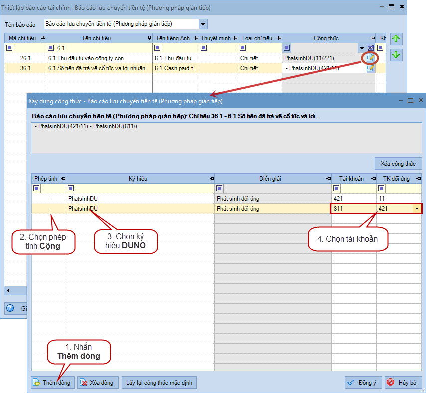 • Đơn vị có nghiệp vụ phạt vi phạm hành chính Nợ TK 811/Có TK 421, sau đó hạch toán Nợ TK 421/11x (đúng ra phải hạch toán Nợ TK 811/Có TK 11x) => Khi đó, Kế toán sẽ bổ sung thêm công thức tính cho chỉ tiêu 36.16.1 Số tiền đã trả về cổ tức và lợi nhuận, thêm công thức PhatsinhDU(811/421) để giảm đi