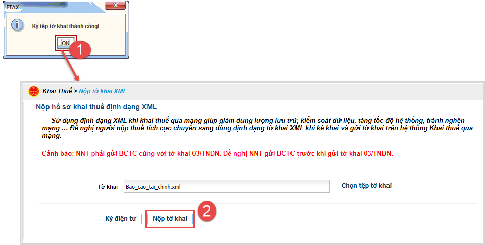 Bước 3: Chọn tab Khai Thuế\ Nộp tờ khai XML, nhấn Chọn tệp tờ khai. Bước 4: Chọn file BCTC đã được xuất khẩu ra định dạng .xml ở bước 1. Bước 5: Nhấn Ký điện tử. Bước 6: Nhập mã PIN Chữ ký số, nhấn Login. Bước 7: Chương trình hiển thị thông báo Ký tệp tờ khai thành công. Nhấn Nộp tờ khai để nộp bộ BCTC cho cơ quan thuế. Bước 8: Thuyết minh BCTC và Bảng cân đối tài khoản sẽ nộp theo dạng phụ lục đính kèm như sau: Lưu ý: Phụ lục phải có định dạng .docx hoặc .xlsx.