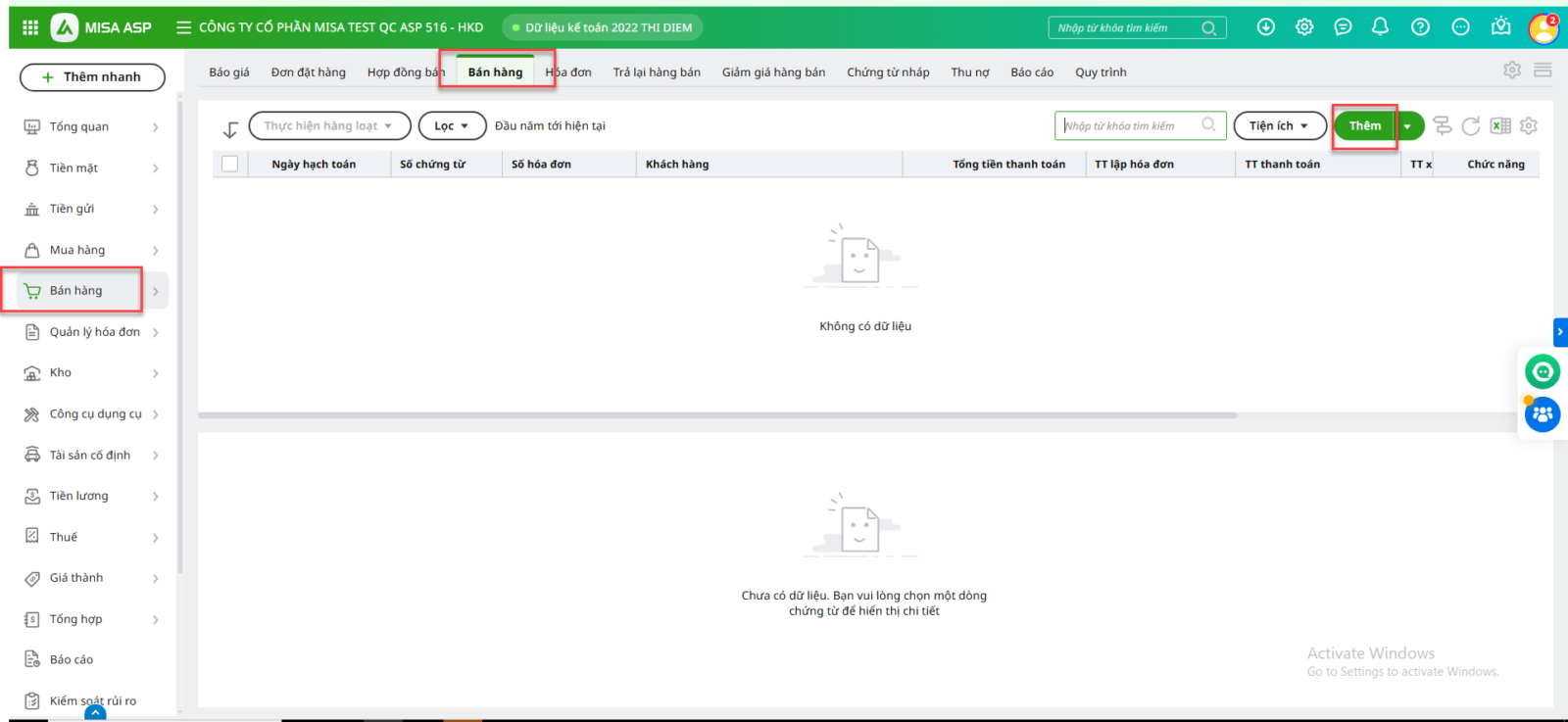 Bước 1: Vào phân hệ Bán hàng, chọn tab Bán hàng và nhấn Thêm chứng từ bán hàng