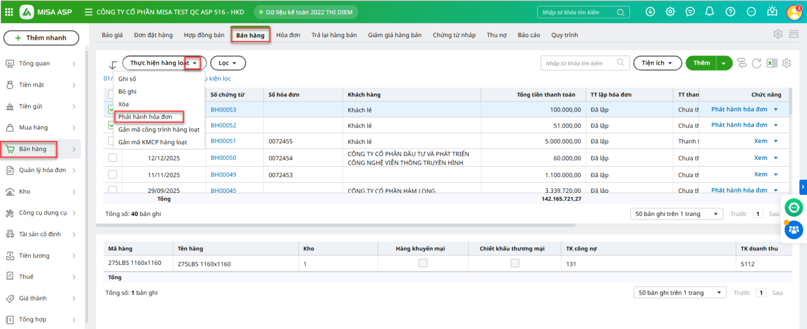 • Tích chọn các hóa đơn cần phát hành trên danh sách sau đó tích Thực hiện hàng loạt\Phát hành hóa đơn.