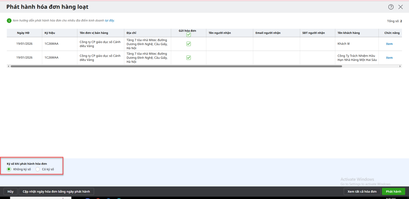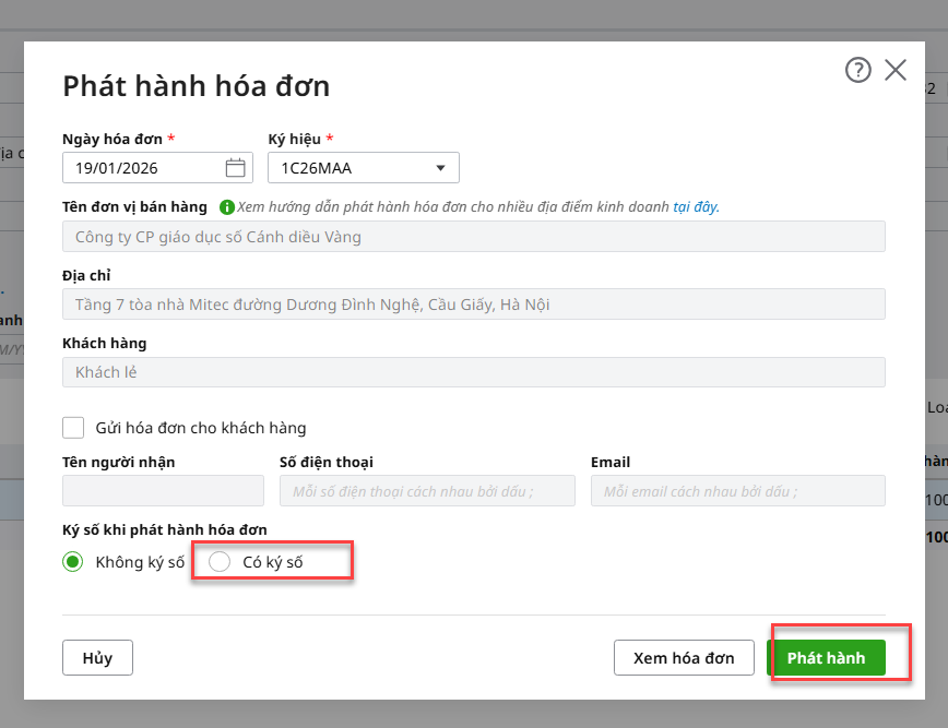 • Phát hành từng hóa đơn: tùy chọn Có ký số hoặc Không ký số