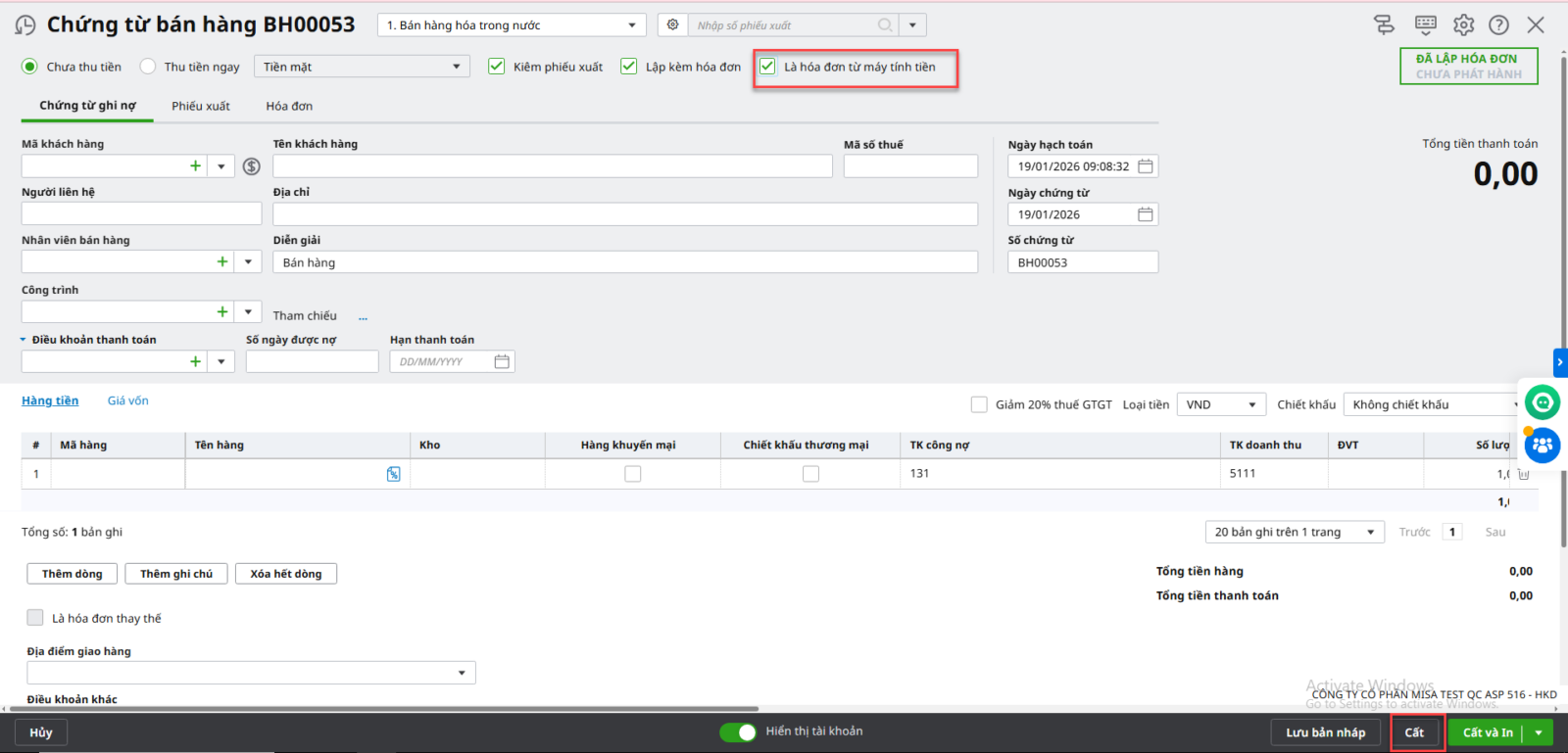 Trường hợp 1: Phát hành từng hóa đơn từ máy tính tiền