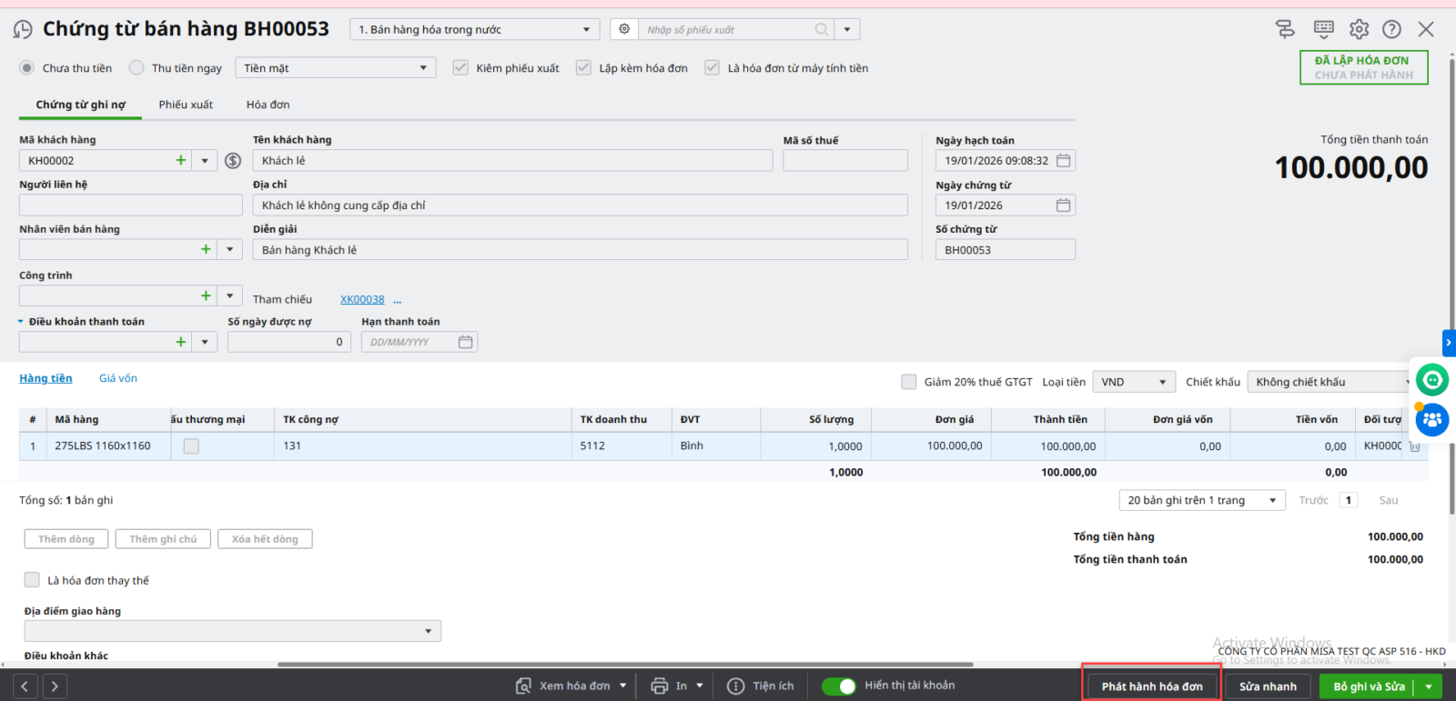 • Nhấn chọn Phát hành hóa đơn trên giao diện Chứng từ bán hàng