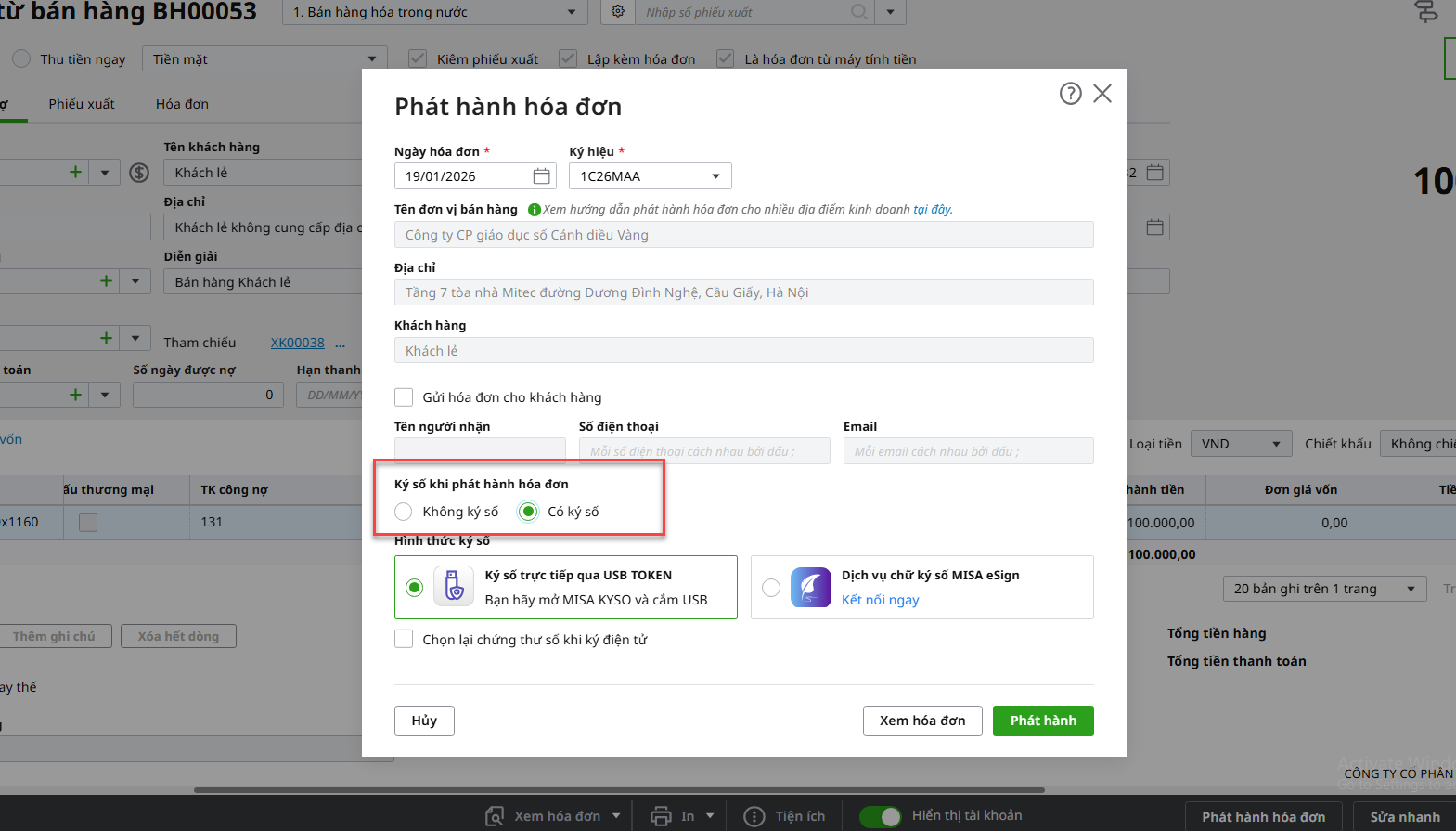 • Tích chọn Có ký số khi phát hành hóa đơn