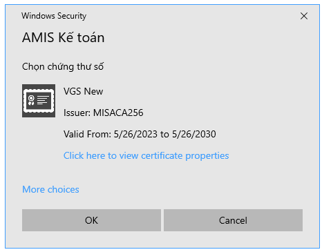 • Anh/chị chọn lại chứng thư số. Sau đó, nhấn OK.