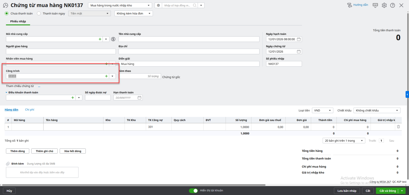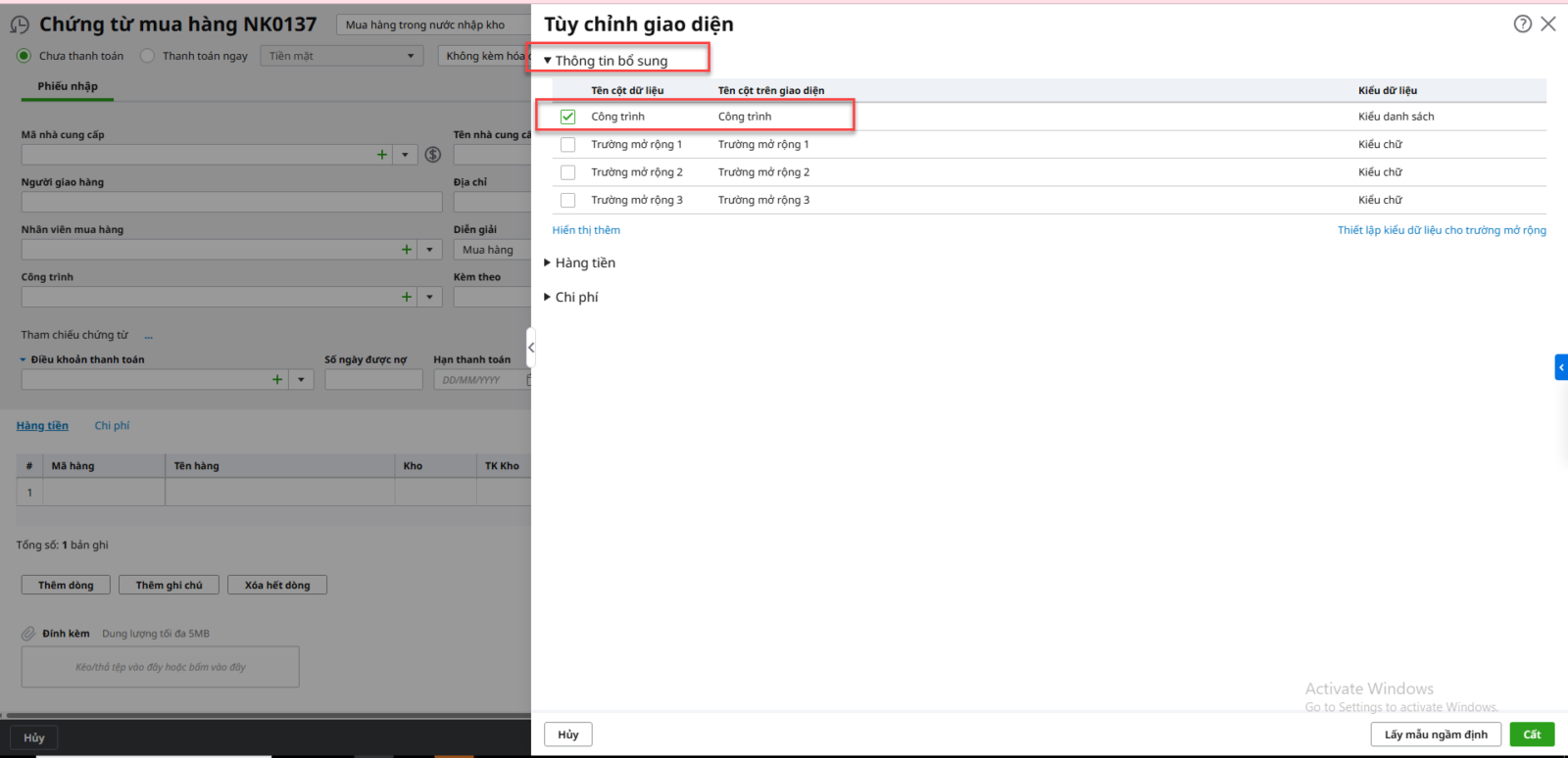 - Trên giao diện thông tin chung của chứng từ, chương trình bổ sung trường Công trình: