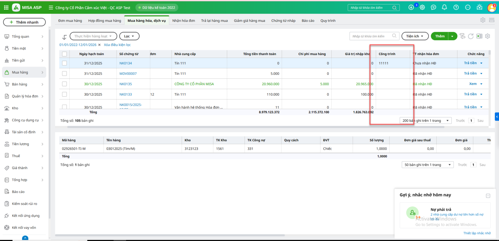 - Trên danh sách chứng từ mua hàng, nhập/xuất kho cũng được bổ sung thông tin Công trình:
