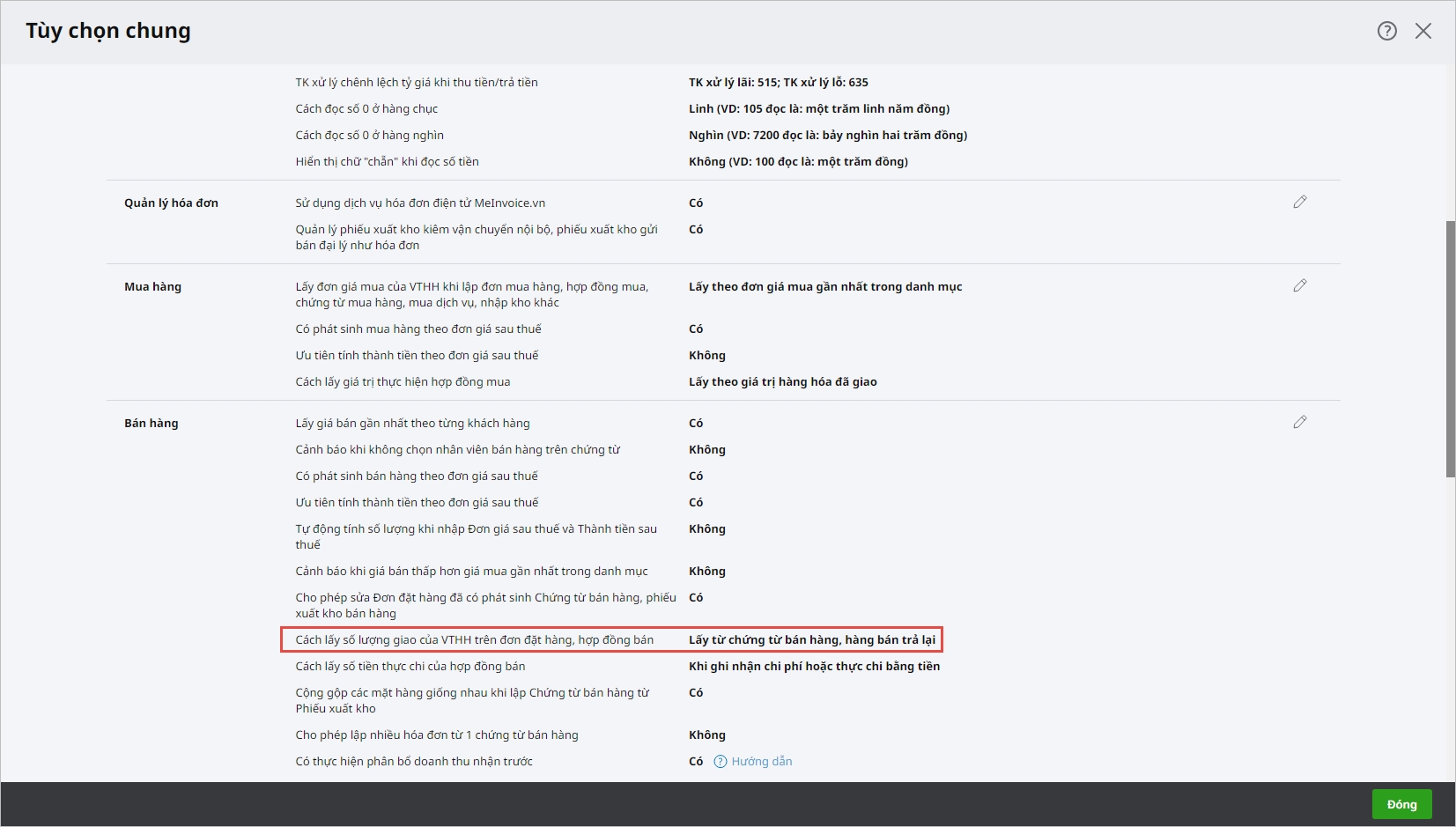 - Thiết lập tùy chọn lấy số lượng giao của vật tư hàng hóa khi in đơn đặt hàng.