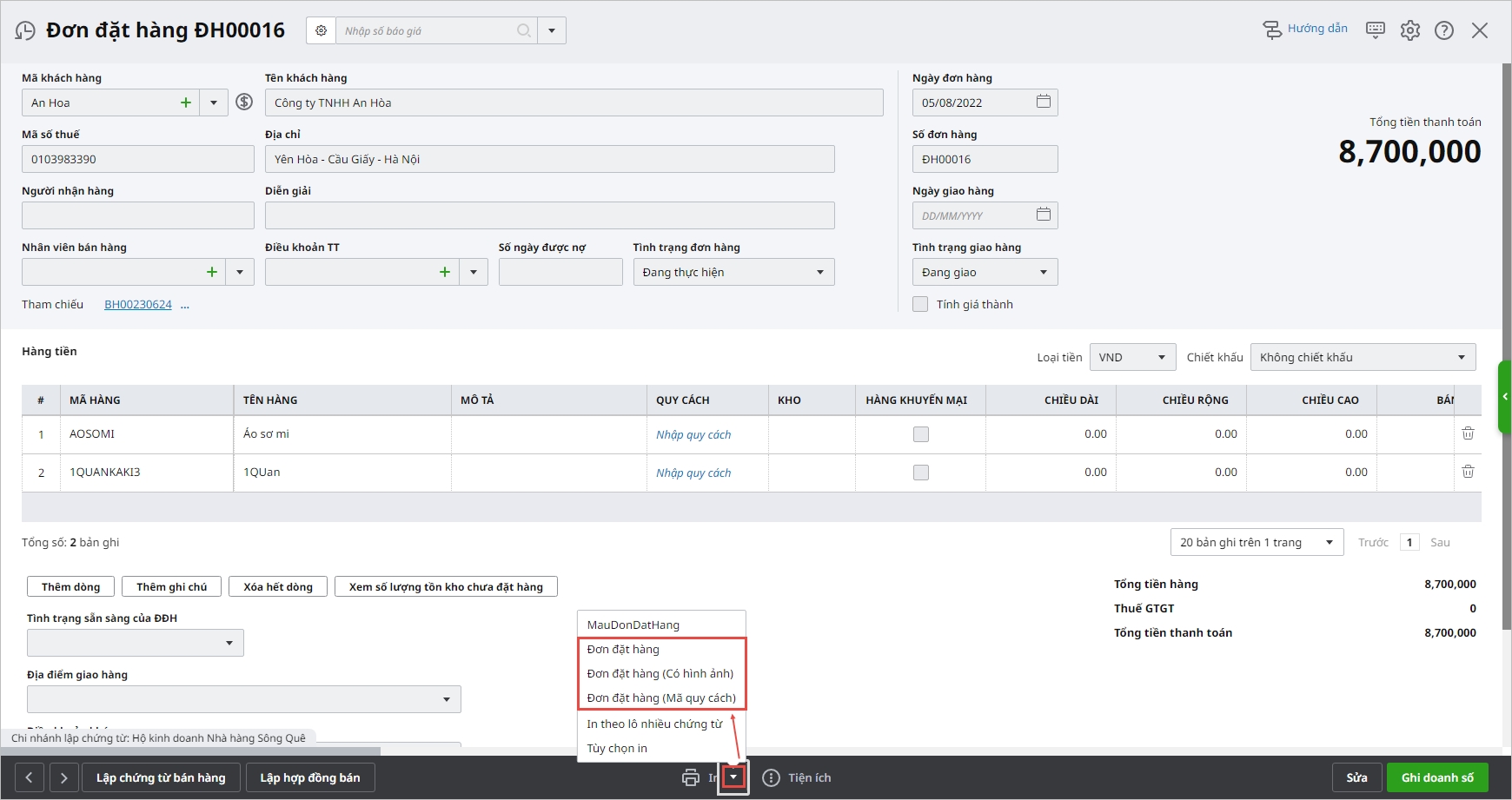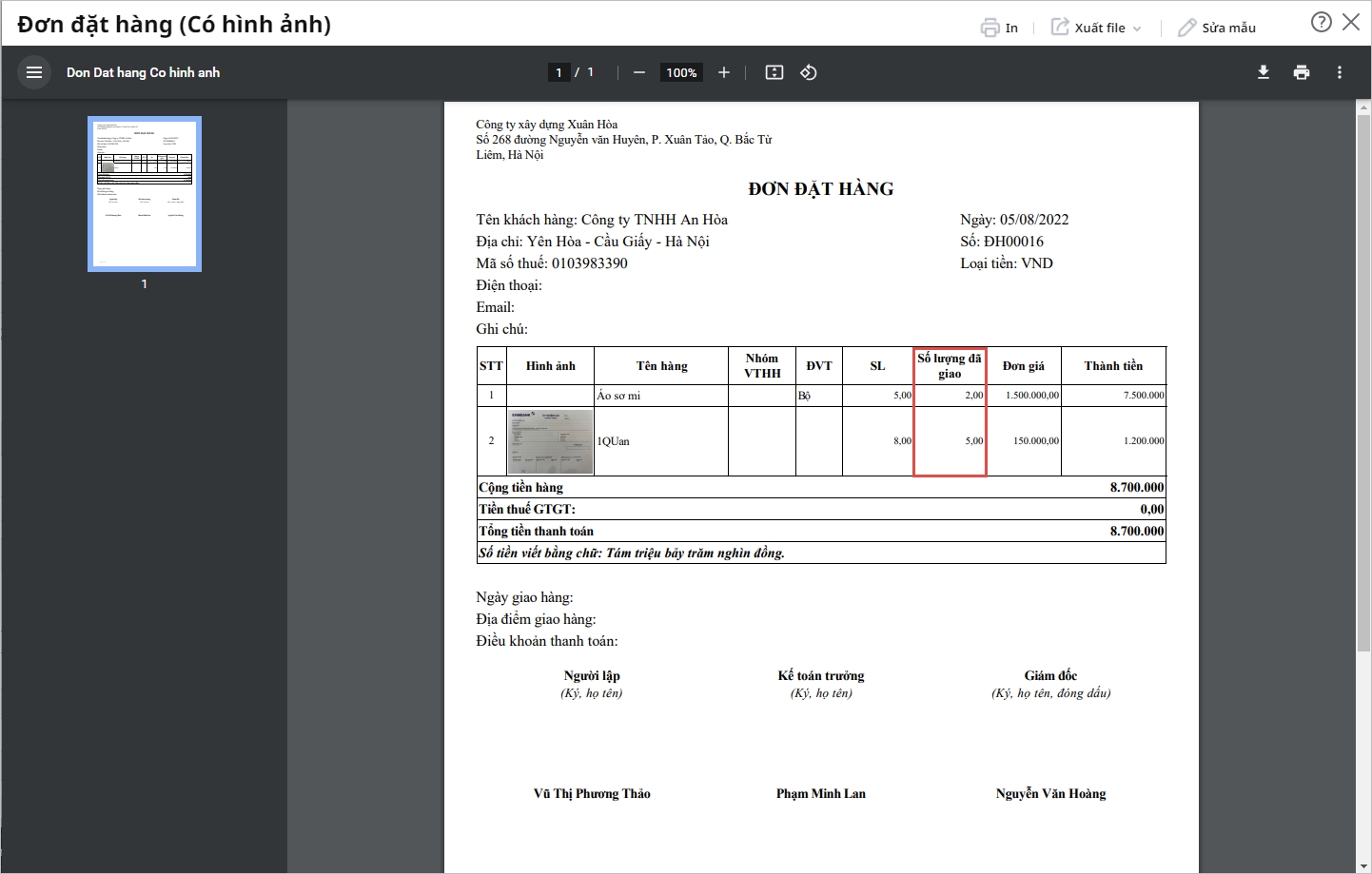 - Hướng dẫn in đơn đặt hàng và hiển thị số lượng đã giao trên giao diện in.