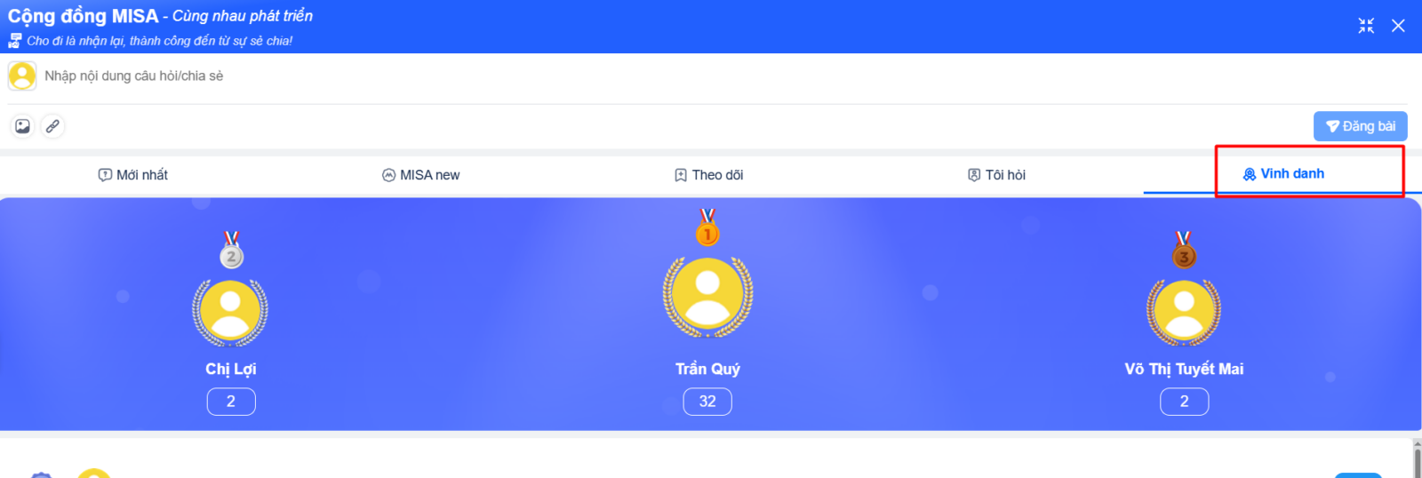 • Theo dõi các thành viên có đóng góp tích cực trong cộng đồng tại mục Vinh danh