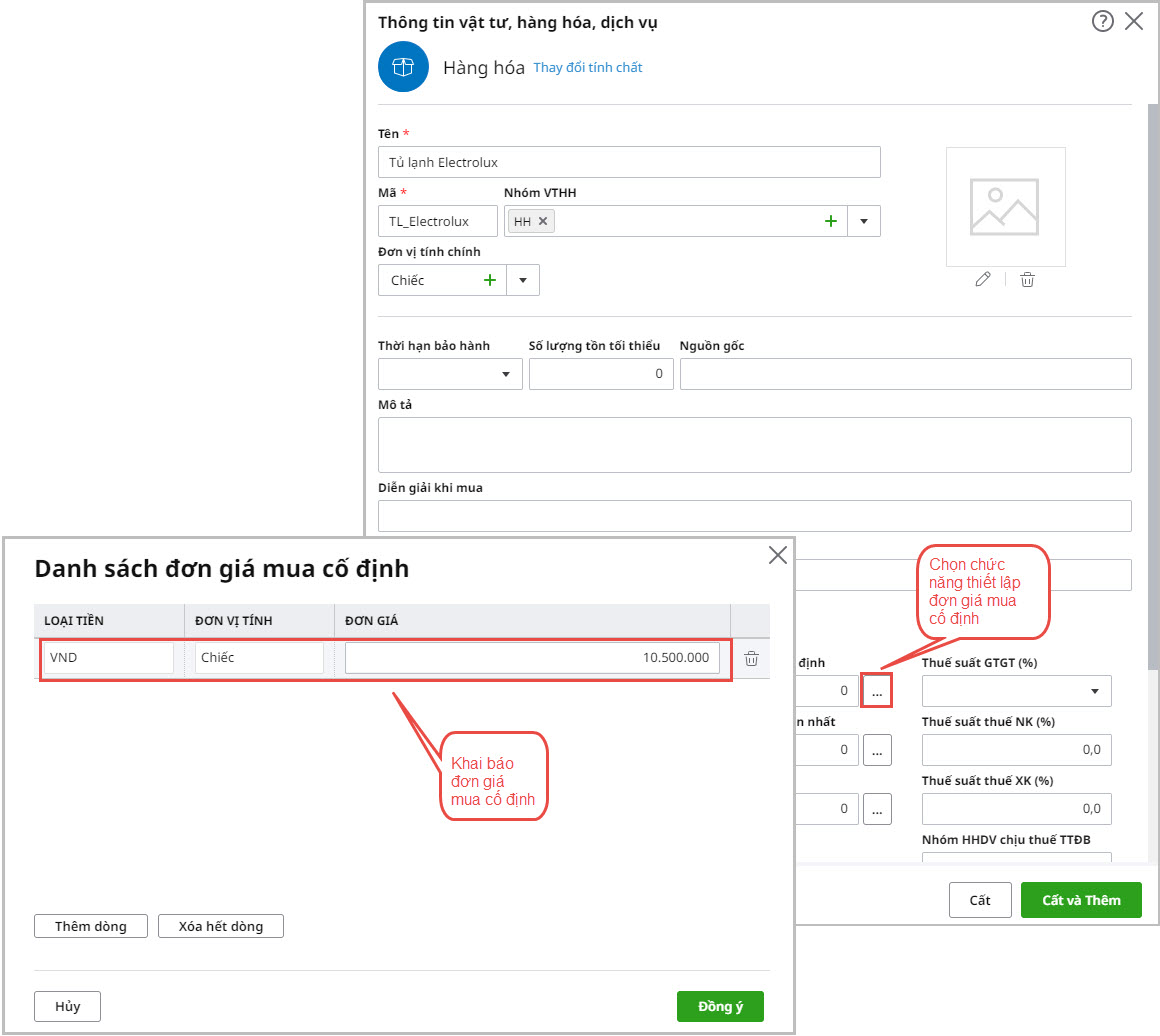 Bước 1: Thiết lập Đơn giá mua cố định: Nhấn chuột vào biểu tượng … tại phần thông tin Đơn giá mua cố định khi khai báo vật tư, hàng hoá
