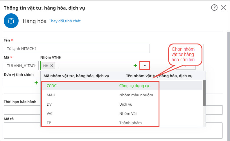 - Cách chọn nhóm vật tư, hàng hóa, dịch vụ từ danh mục đã khai báo