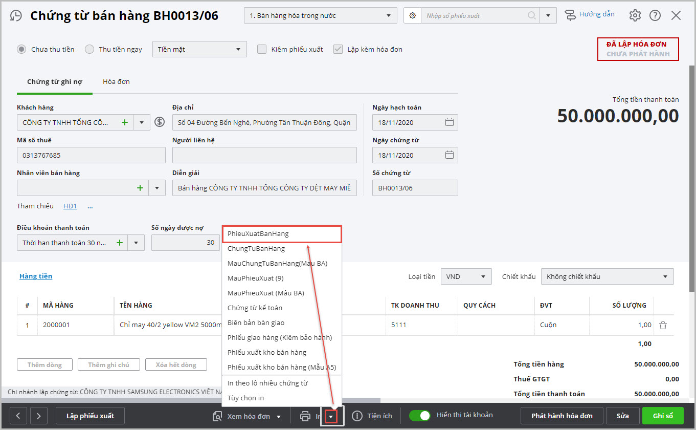 2.2. Cập nhật file mẫu chứng từ đặc thù vào phần mềm để sử dụng và in ấnMở giao diện chi tiết của một chứng từ bán hàng đã có sẵn tại màn hình danh sách