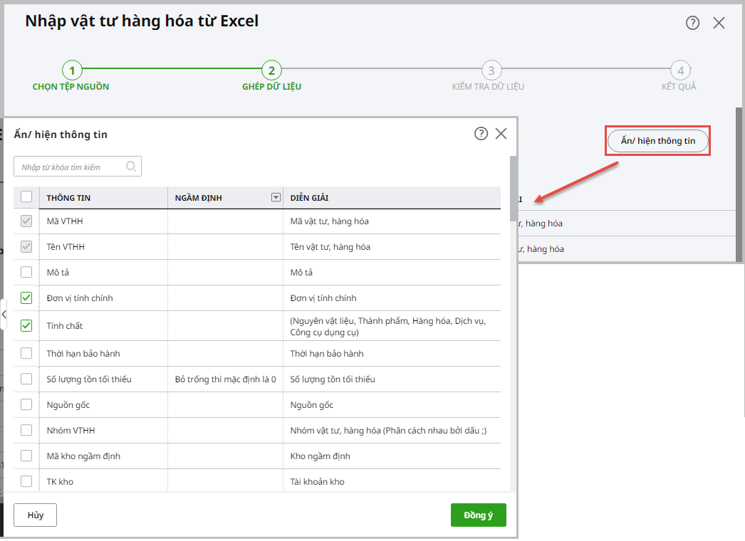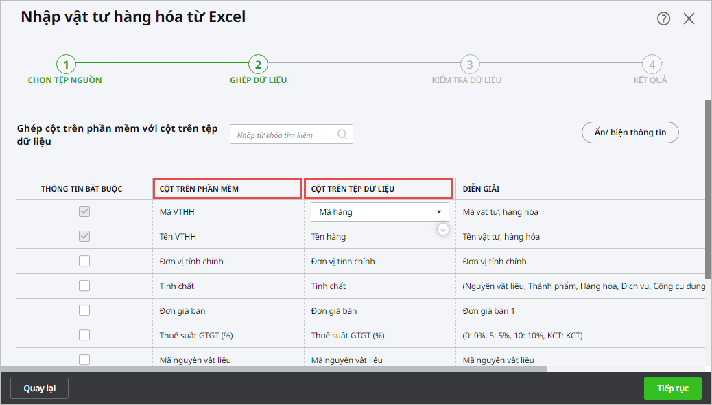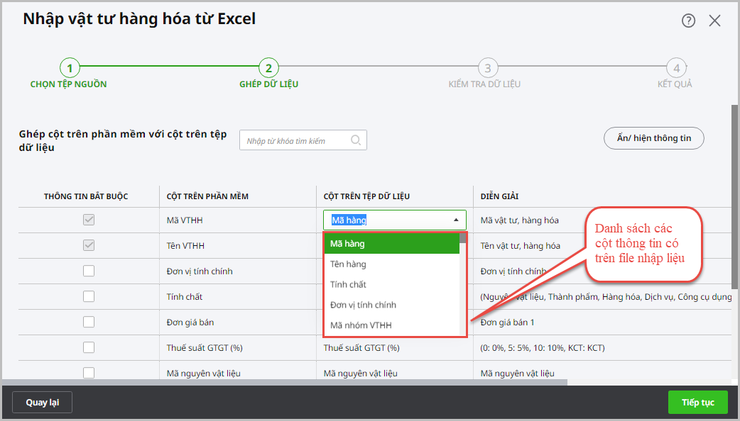 Bước 4: Ghép dữ liệu: Tương tự như khi nhập khẩu danh mục có thể ghép được các cột dữ liệu trên file nhập khẩu và trên chương trình Bước 5: Kiểm tra dữ liệu: Chương trình sẽ trả về kết quả dữ liệu hợp lệ hoặc không hợp lệ trên file dữ liệu có thể điều chỉnh hoặc tiến hành nhập dữ liệu luôn. Bước 6: Thông báo kết quả nhập liệu |