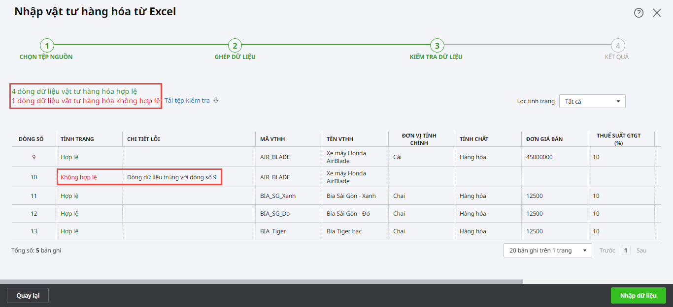 Lưu ý: Trường hợp khi nhập khẩu vào phần mềm báo lỗi không hợp lệ thì xem hướng dẫn xử lý tại đây