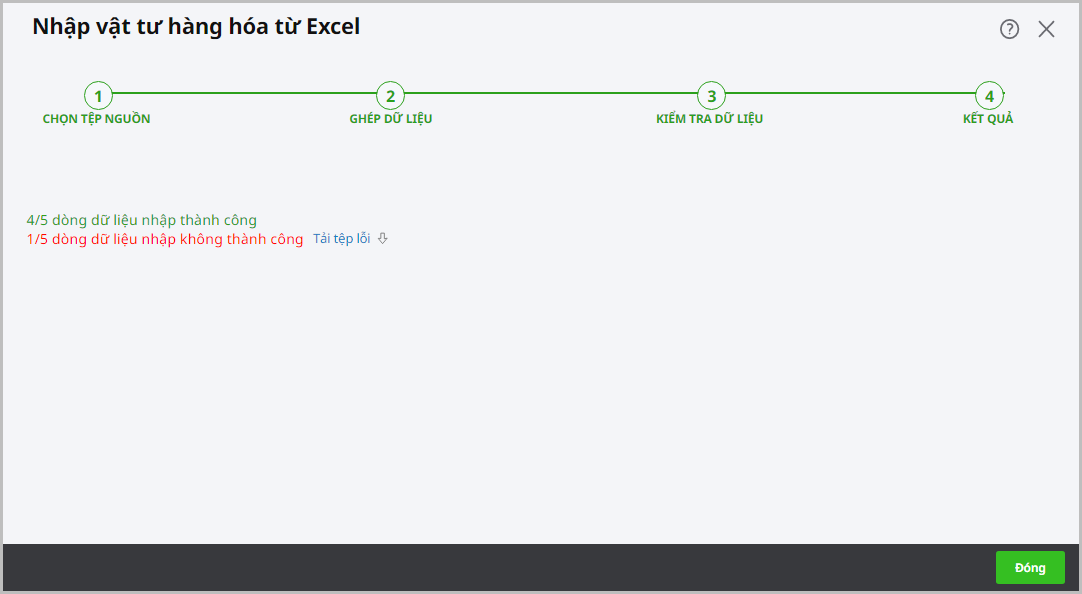 Bước 7: Nhấn Đóng hoặc nhấn biểu tượng dấu X để hoàn thành nhập khẩu danh mục. 2.2. Nhập số dư từ file ExcelBước 1: Vào bánh răng ⚙ Các tiện ích và thiết lập\Nhập số dư ban đầu