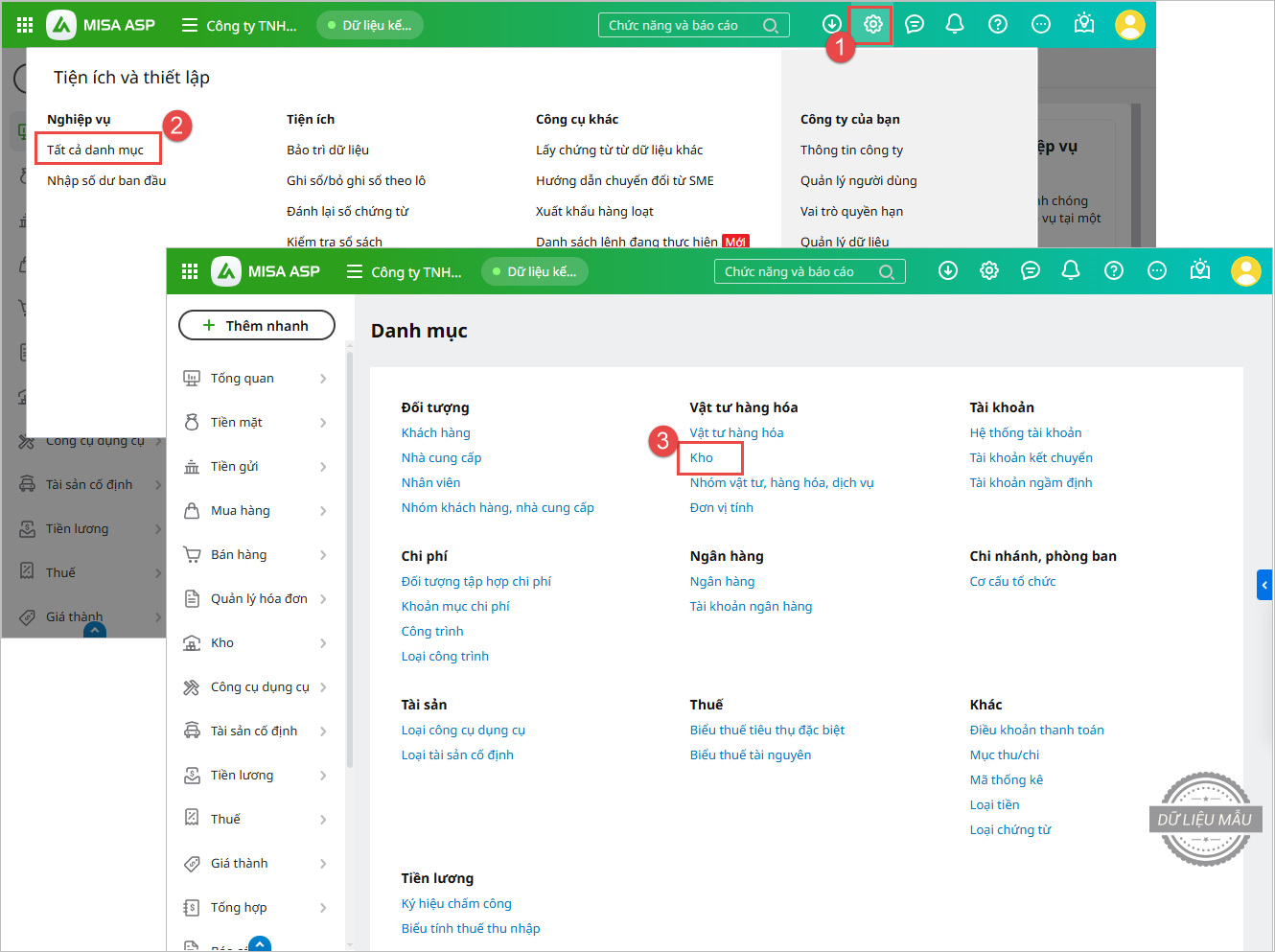- Chọn Tiện ích và thiết lập\Tất cả danh mục\Vật tư hàng hóa\Kho