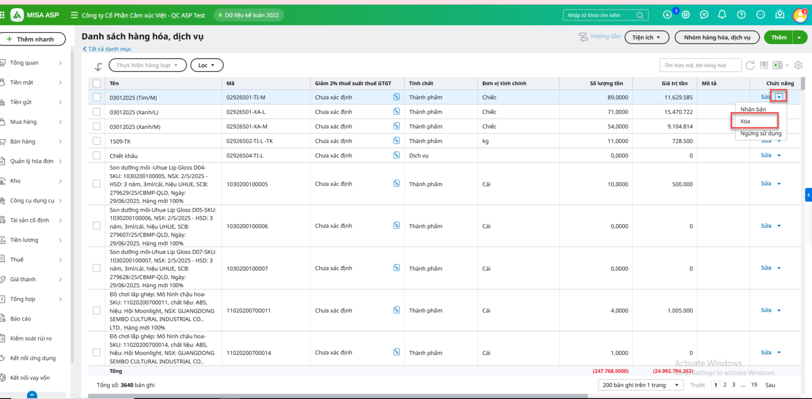 Lưu ý: Có thể sửa mã VTHH bằng cách vào Danh mục\Vật tư hàng hóa\tại cột Chức năng, bấm sửa