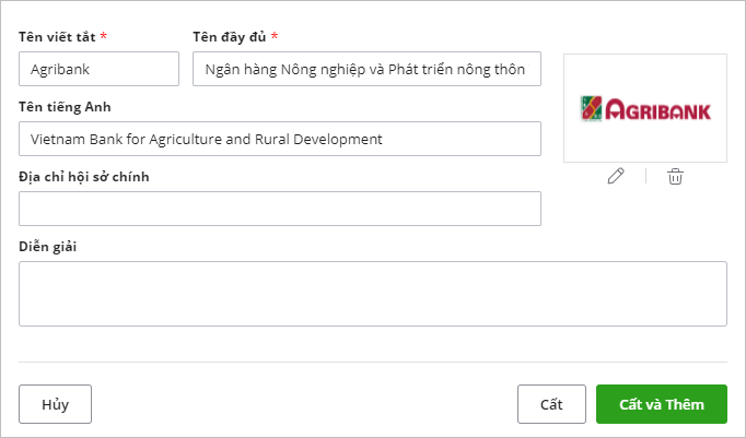 Bước 4: Khai báo các thông tin về ngân hàng. Với các thông tin có ký hiệu (*) gồm Tên viết tắt và Tên đầy đủ thì kế toán sẽ bắt buộc phải khai báo.