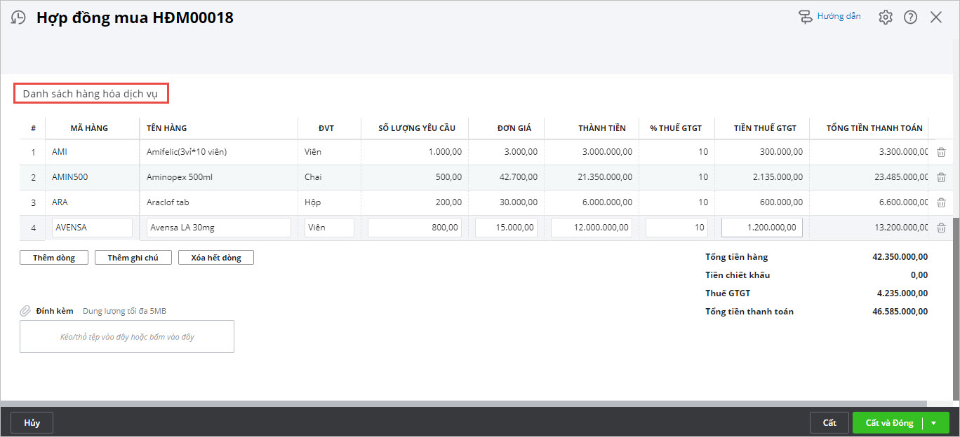 - Khai báo các hàng hóa dịch vụ được mua theo hợp đồng.