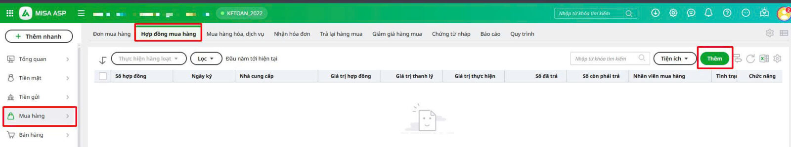 Bước 1: Tại quy trình Mua hàng\Hợp đồng mua hàng, chọn chức năng Thêm (hoặc trên tab Hợp đồng mua hàng chọn chức năng Thêm).