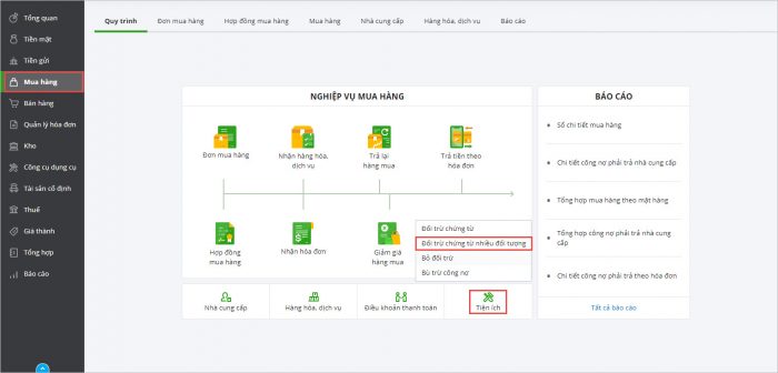 Bước 1: Tại phân hệ Mua hàng\Quy trình\Tiện ích, chọn chức năng Đối trừ chứng từ nhiều đối tượng.