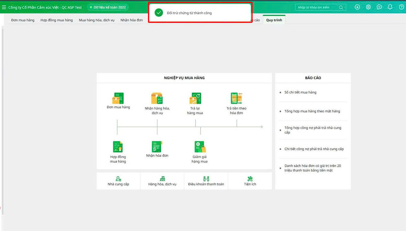 • Sau khi thực hiện đối trừ chứng từ thành công, chương trình sẽ hiển thị thông báo Đối trừ chứng từ thành công.