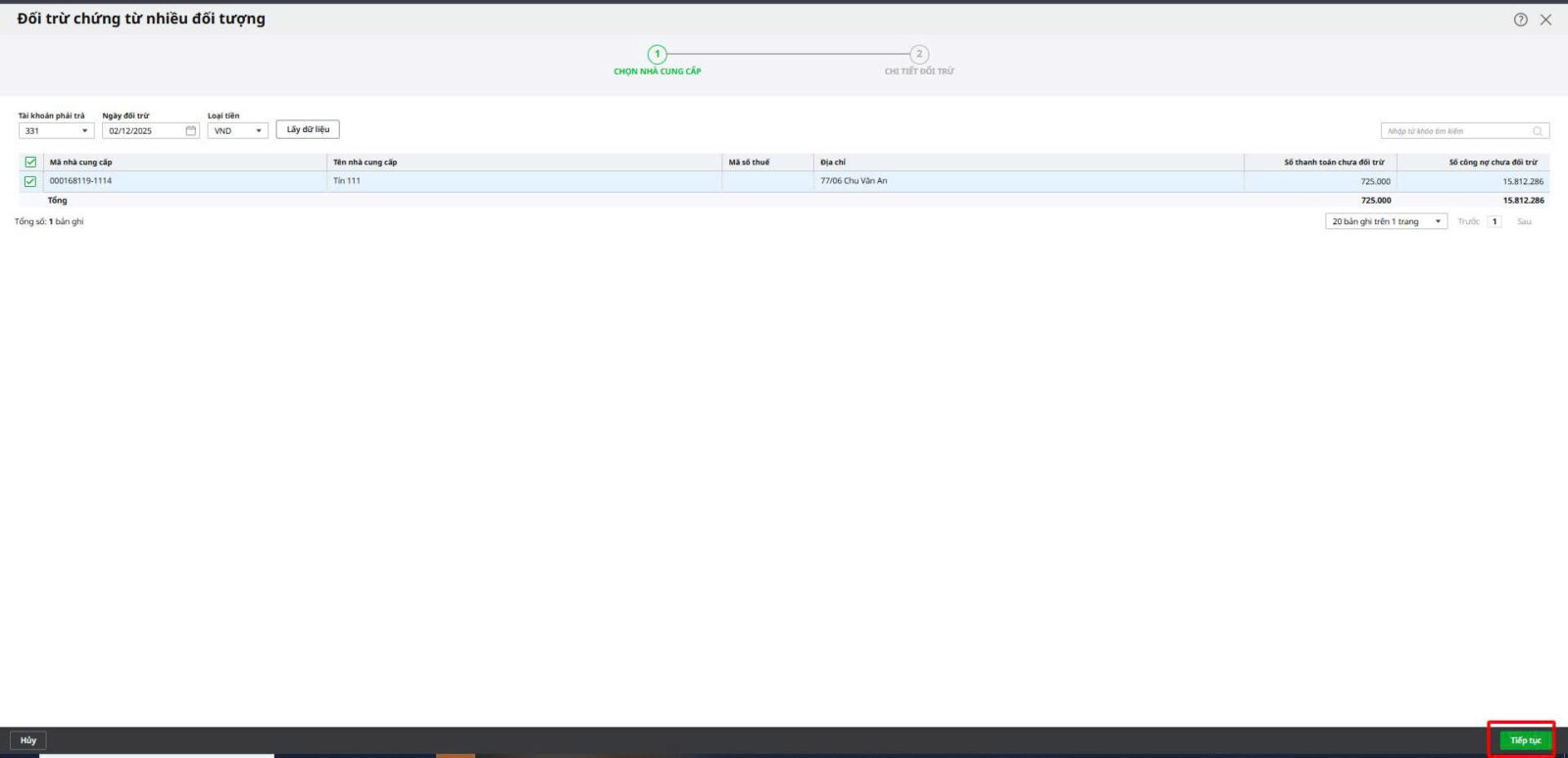 Bước 3: Tích chọn các nhà cung cấp sẽ được đối trừ chứng từ, sau đó nhấn Tiếp tục.