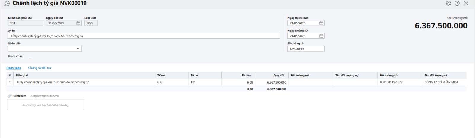 Bước 1: Sau khi Anh/Chị hoàn thành chức năng đối trừ chứng từ, hệ thống tự động sinh ra chứng từ xử lý chênh lệch tỷ giá