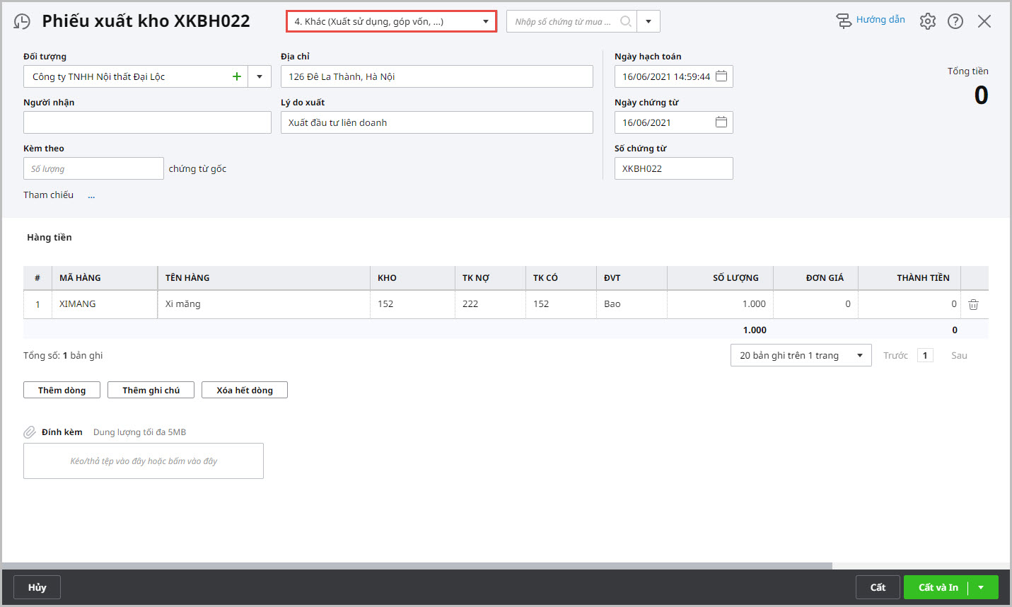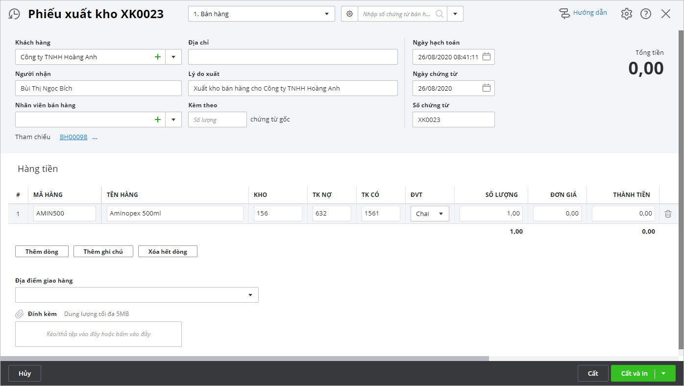 Bước 4. Sau khi khai báo xong, nhấn Cất. Bước 5. Chọn chức năng In trên thanh công cụ, sau đó chọn chứng từ xuất kho cần in. Có thể in chứng từ xuất kho theo mẫu do phần mềm cung cấp hoặc theo mẫu đặc thù của doanh nghiệp (xem thêm chức năng Thiết kế mẫu chứng từ). |