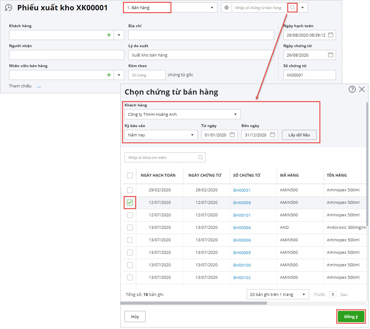 Bước 1. Tại phân hệ Kho\Quy trình, chọn chức năng Xuất kho (hoặc trên tab Nhập, xuất kho chọn chức năng Thêm\Xuất kho). Bước 2. Chọn loại chứng từ xuất kho là Bán hàng, sau đó chọn chứng từ bán hàng đã được lập trên phân hệ Bán hàng, tab Bán hàng. Bước 3. Thiết lập điều kiện chọn chứng từ bán hàng
