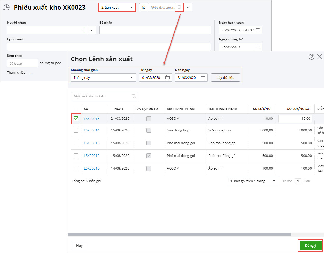 Bước 1. Tại phân hệ Kho\Quy trình, chọn chức năng Xuất kho (hoặc trên tab Nhập, xuất kho chọn chức năng Thêm\Xuất kho). Bước 2. Chọn loại chứng từ xuất kho là Sản xuất, sau đó chọn lệnh sản xuất đã được lập trên tab Lệnh sản xuất. Bước 3. Thiết lập điều kiện chọn lệnh sản xuất