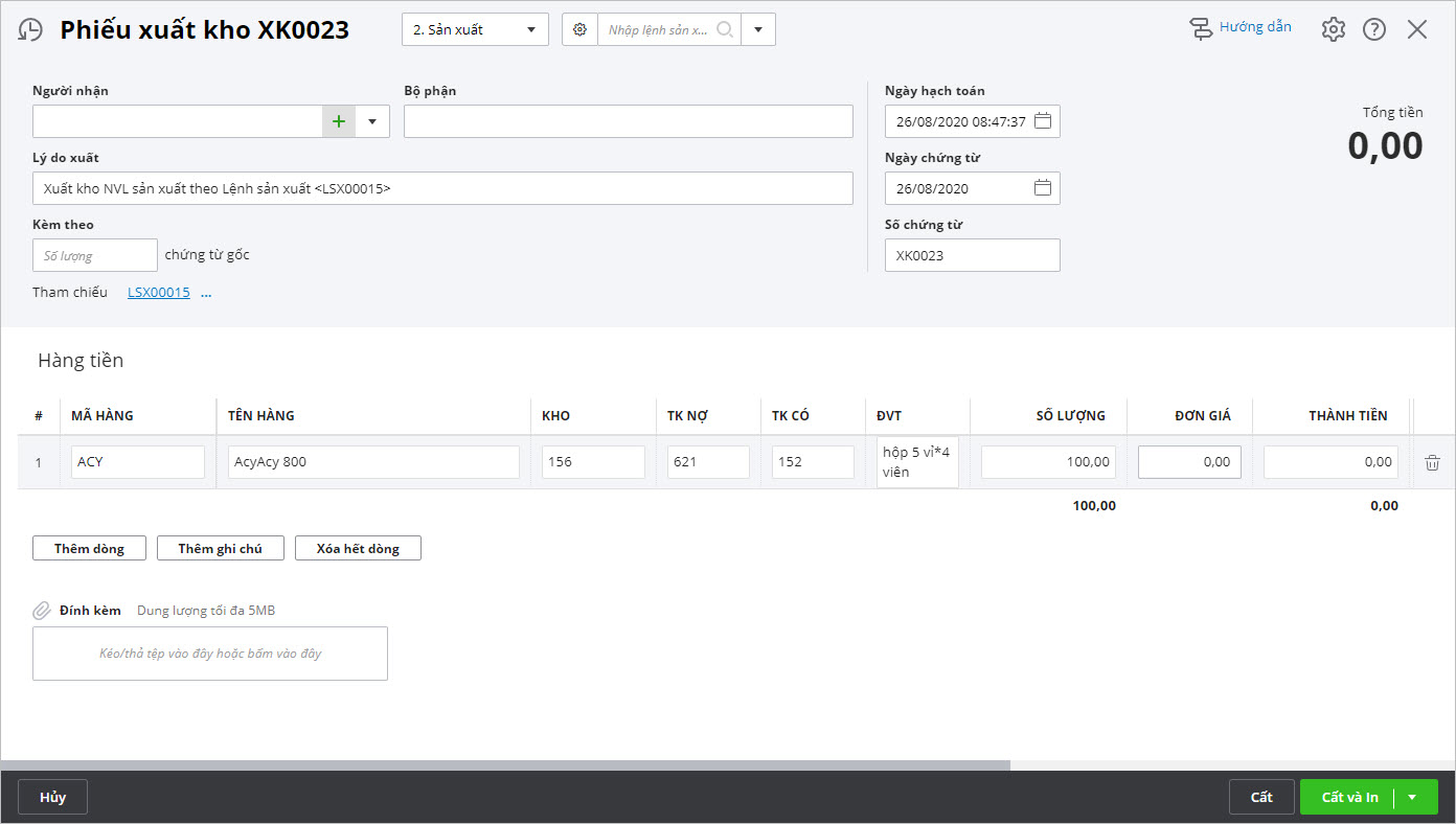 Bước 5. Chọn chức năng In trên thanh công cụ, sau đó chọn chứng từ xuất kho cần in. Có thể in chứng từ xuất kho theo mẫu do phần mềm cung cấp hoặc theo mẫu đặc thù của doanh nghiệp. Lưu ý: Có thể khai báo trực tiếp chứng từ xuất kho bán hàng mà không phải chọn từ chứng từ bán hàng hoặc lập chứng từ xuất kho bán hàng từ đơn đặt hàng. 3.2 Lập phiếu xuất kho sản xuất