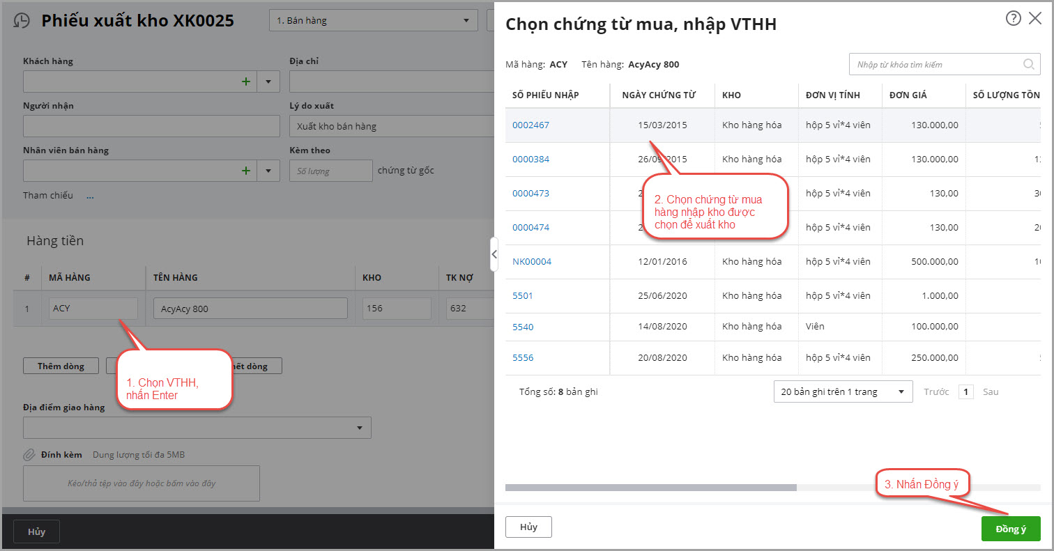 - Với phương pháp Đích danh: khi chọn vật tư hàng hoá để xuất kho, hệ thống sẽ hiển danh sách các các chứng từ mua hàng hoặc nhập kho để lựa chọn. Khi đó đơn giá trên chứng từ được chọn sẽ cập nhật vào đơn giá xuất của phiếu xuất kho.