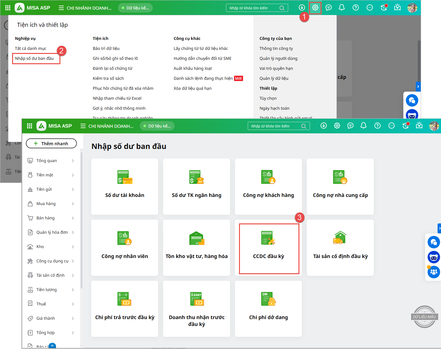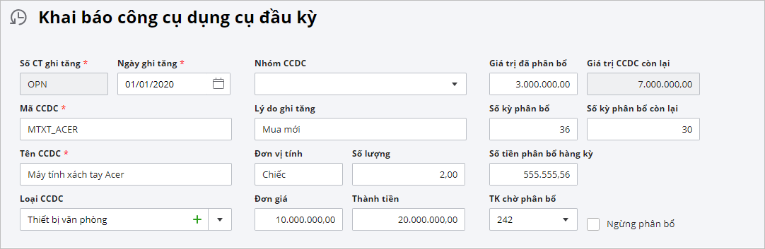 Việc theo dõi CCDC trên 2 hệ thống sổ này phải khớp nhau. Do đó, khi khai báo CCDC đầu kỳ thì giá trị của CCDC đầu kỳ phải được phản ánh tương ứng trên số dư đầu kỳ của tài khoản 242.