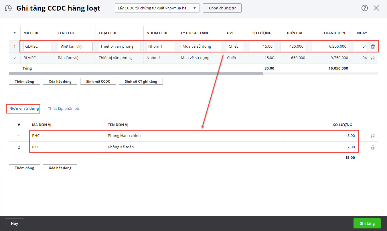 Nội dung bài viết bao gồm hướng dẫn thao tác ghi tăng CCDC, khai báo thông tin, thiết lập đơn vị sử dụng và phân bổ giá trị.