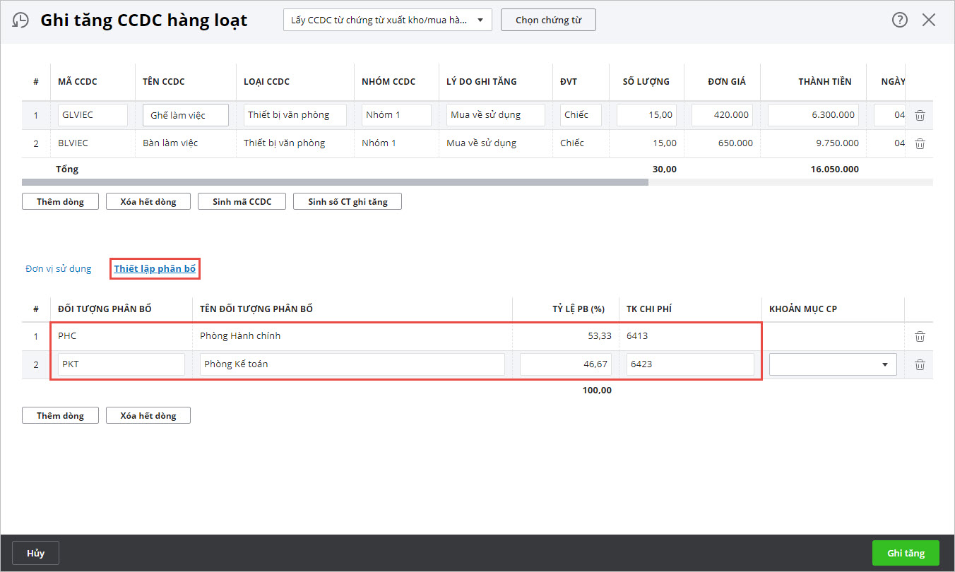 Bước 4: Khai báo các đối tượng được phân bổ giá trị CCDC trên tab Thiết lập phân bổ. => Hệ thống đã tự động thiết lập thông tin phân bổ (các đối tượng được phân bổ chính là các đơn vị sử dụng CDCD, còn tỷ lệ phân bổ thì căn cứ vào số lượng CCDC sử dụng của các đơn vị đó), tuy nhiên kế toán vẫn có thể thay đổi lại theo đúng với thực tế tại doanh nghiệp.