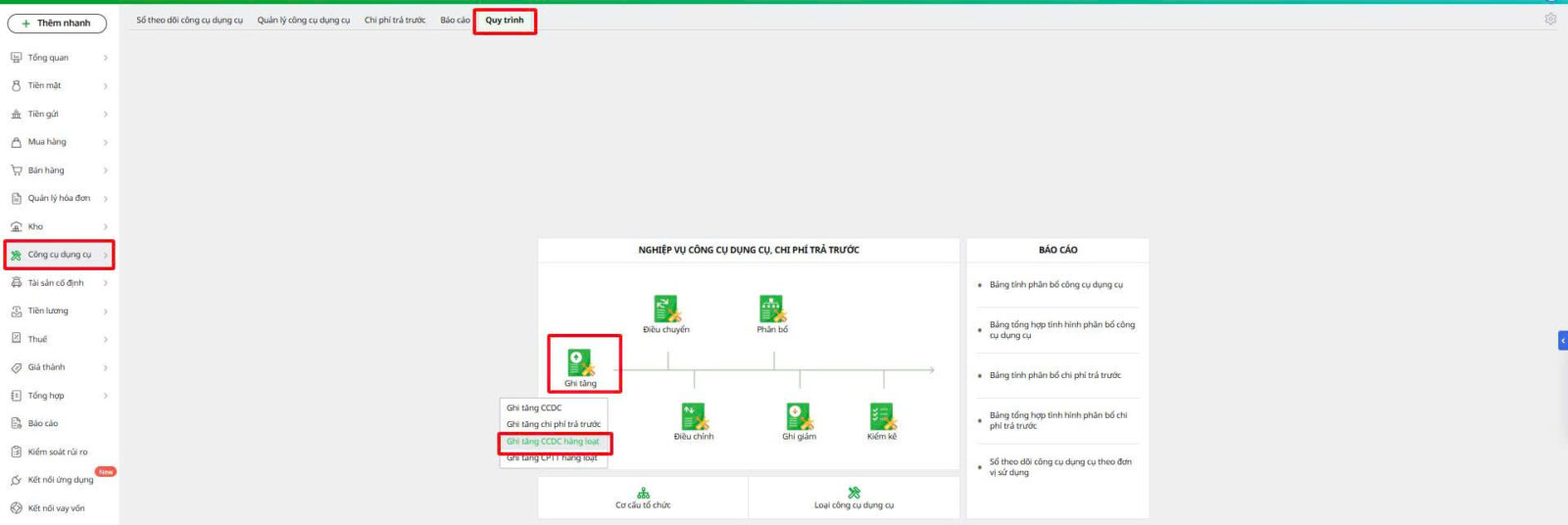 Bước 1: Tại phân hệ Công cụ dụng cụ\ Quy trình\ Ghi tăng, chọn chức năng Ghi tăng CCDC hàng loạt: