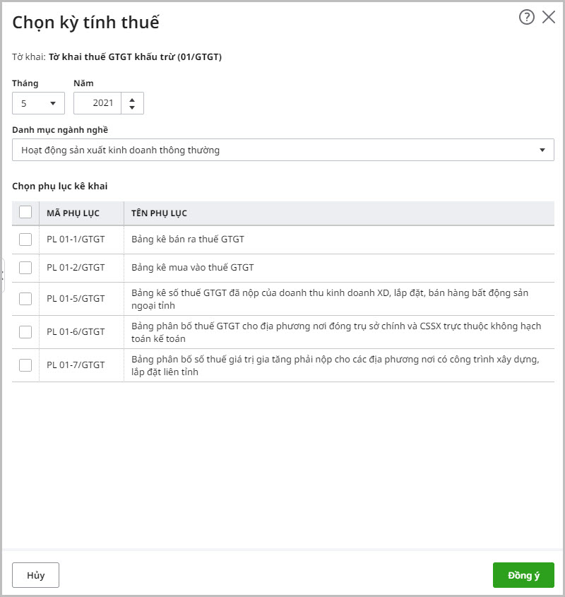 Bước 3: Tích chọn vào phụ lục cần thêm, nhấn Đồng ý, chương trình sẽ thêm phụ lục vào tờ khai đang lập.