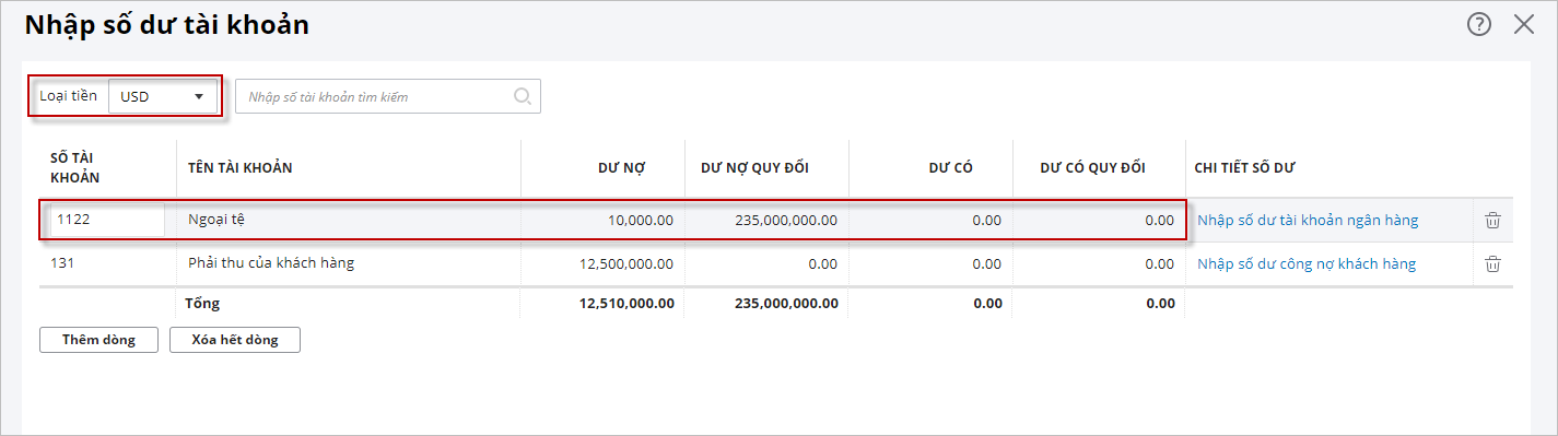 - Nhập số dư tài khoản ngoại tệ trực tiếp trên phần mềm.