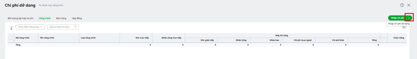 Lưu ý: Cần khai báo danh mục Công trình trước khi nhập chi phí dở dang.