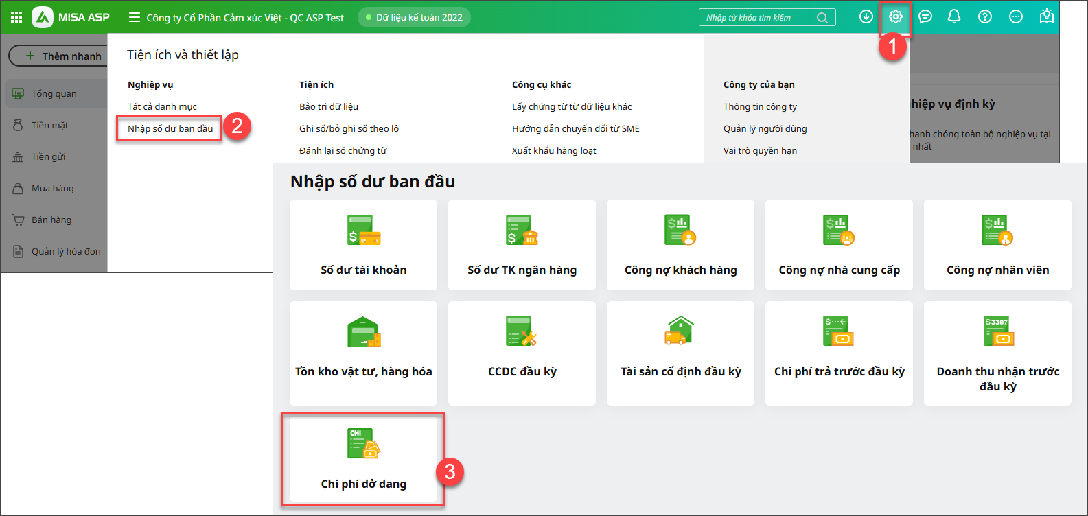 • Vào Thiết lập\Nhập số dư ban đầu\chọn Chi phí dở dang.