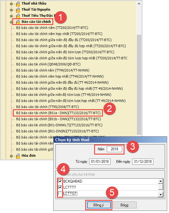 Bước 2: Chọn mục Báo cáo tài chính, chọn Bộ báo cáo tài chính tương ứng với Bộ báo cáo đã xuất từ phần mềm (cùng thông tư áp dụng, cùng kỳ kê khai, cùng báo cáo).
