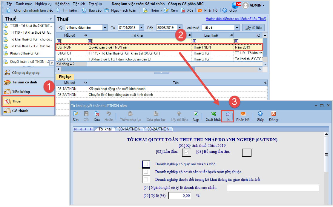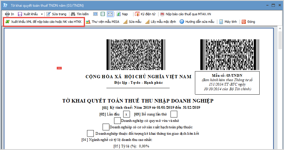 2.2 Xuất khẩu tờ khai quyết toán thuế TNDNBước 1: Mở tờ khai quyết toán thuế TNDN đã lập lên