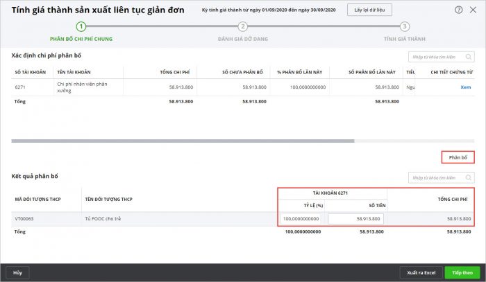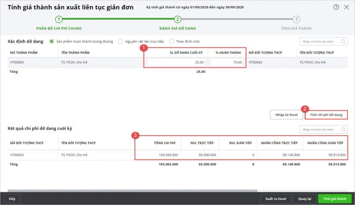 Bước 1: Vào phân hệ Giá thành\tab Sản xuất liên tục – Giản đơn, chọn chức năng Thêm kỳ tính giá. Bước 2: Chọn kỳ tính giá thành và đối tượng tập hợp chi phí đã được khai báo ở bước 2. Bước 3: Sau khi khai báo xong, nhấn Cất. 2.7 Tính giá thành sản phẩm