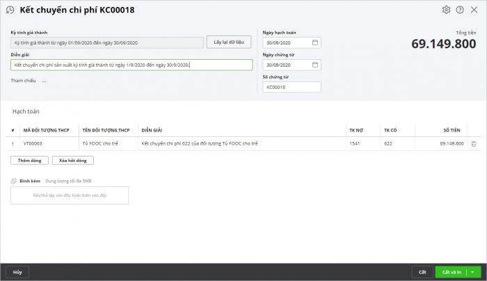 Bước 1: Vào phân hệ Giá thành\tab Sản xuất liên tục – Giản đơn, tại màn hình danh sách chọn chức năng Kết chuyển chi phí. Bước 2: Chọn kỳ tính giá thành, sau đó nhấn Đồng ý => hệ thống sẽ tự động tổng hợp chi phí của các tài khoản 621, 622, 627… để kết chuyển sang 154. ![]() Bước 3: Kiểm tra lại chứng từ kết chuyển, sau đó nhấn Cất. Lưu ý: Thao tác tương tự khi tính giá thành cho sản phẩm mang đi gia công tính theo phương pháp Hệ số, tỷ lệ. |