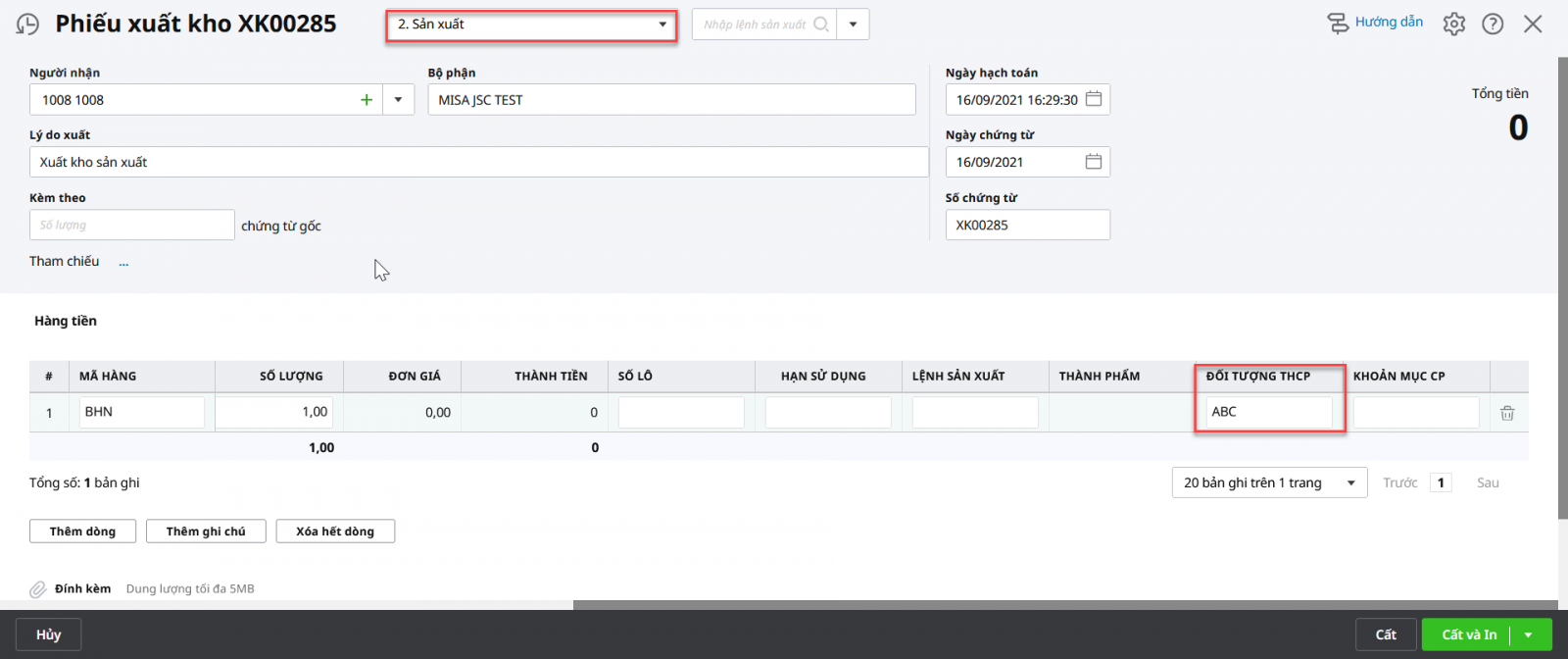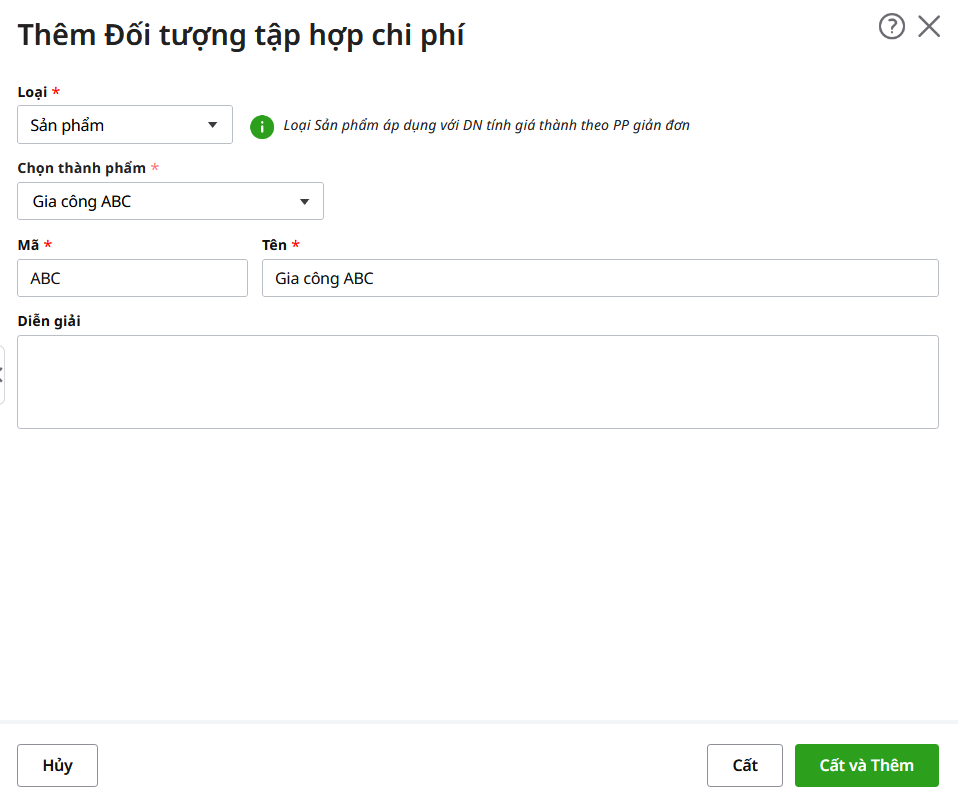 Bước 1: Vào Tiện ích và thiết lập\Tất các danh mục\ Đối tượng tập hợp chi phí, chọn chức năng Thêm. Bước 2: Chọn loại đối tượng tập hợp chi phí là Sản phẩm. Bước 3: Khai báo các thông tin bắt buộc về đối tượng tập hợp chi phí, sau đó nhấn Cất. ![]() Lưu ý: Với phương pháp tính giá giản đơn, mỗi đối tượng tập hợp chi phí sẽ tương ứng với một thành phẩm cần sản xuất ra. 2.3 Xuất kho nguyên vật liệu mang đi gia công