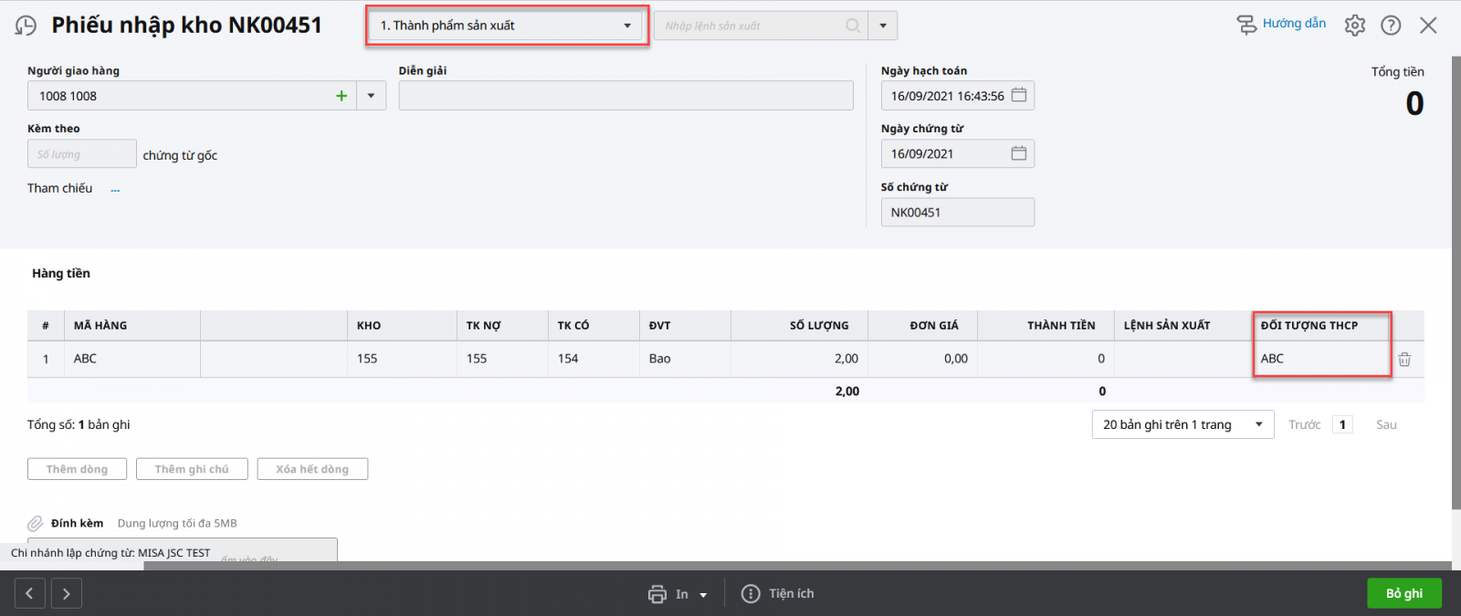 Bước 1: Vào phân hệ Kho\tab Nhập, xuất kho, chọn chức năng Thêm\Nhập kho. Bước 2: Chọn loại chứng từ là Thành phẩm sản xuất. Bước 3: Khai báo chứng từ nhập kho và số lượng thành phẩm hoàn thành được nhập kho. Nhấn Cất. Lưu ý: Cần chọn đối tượng THCP tương ứng. ![]() Lưu ý: Đơn giá của thành phẩm nhập kho sẽ được hệ thống tính và cập nhật sau khi kế toán thực hiện xong việc tính giá trên phân hệ Giá thành. 2.6 Xác định kỳ tính giá thành